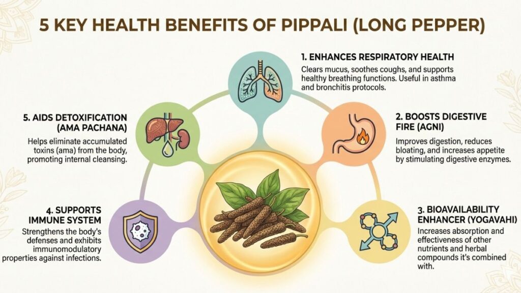 मेरे अनुभव में, पिप्पली(Pippali) की सबसे बड़ी विशेषता इसका ‘अनुपान‘ (जिसके साथ दवा ली जाए) के अनुसार फल देना है। यदि आप इसे शहद के साथ लेते हैं, तो यह कफ को काटती है; यदि घी के साथ लेते हैं, तो यह पित्त और वात को शांत करती है।